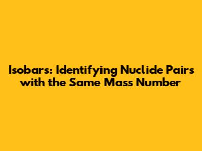 The key thing to remember is that we're looking for nuclides with the same mass number (A) but different atomic numbers (Z). So, the first thing you should do is scan the list for nuclides that have the same mass number. In our example, we see that carbon-14 (¹⁴C) and nitrogen-14 (¹⁴N) both have a mass number of 14. Next, check if these nuclides have different atomic numbers. Carbon has an atomic number of 6, while nitrogen has an atomic number of 7. Since they have different atomic numbers, we can conclude that carbon-14 and nitrogen-14 are indeed isobars! On the other hand, carbon-12 (¹²C) and oxygen-16 (¹⁶O) are not isobars because they have different mass numbers. To make this process even easier, you can create a table with the nuclides, their atomic numbers, and their mass numbers. This will help you visually compare the values and quickly identify potential isobar pairs. Remember to always double-check your work to ensure that you haven't made any mistakes in identifying the atomic and mass numbers. Once you've identified a potential isobar pair, make sure that their atomic numbers are different, as this is a crucial requirement for isobars. By following this systematic approach, you'll be able to confidently identify isobar pairs in any given list of nuclides. It's all about paying attention to the details and understanding the definitions of atomic number and mass number.